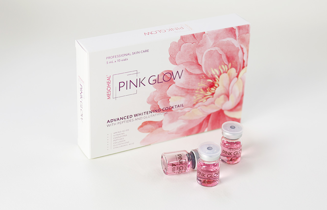 ピンクグロー(PINK GLOW)は非架橋ヒアルロン酸、23種類のアミノ酸、アスコルビン酸(ビタミンC)を中心に13種類のビタミン類、グルタチオン、ポリヌクレオチド、ナイアシンアミド、コラーゲン、コエンザイムなど50種類以上の美肌成分を配合したメソカクテルです。