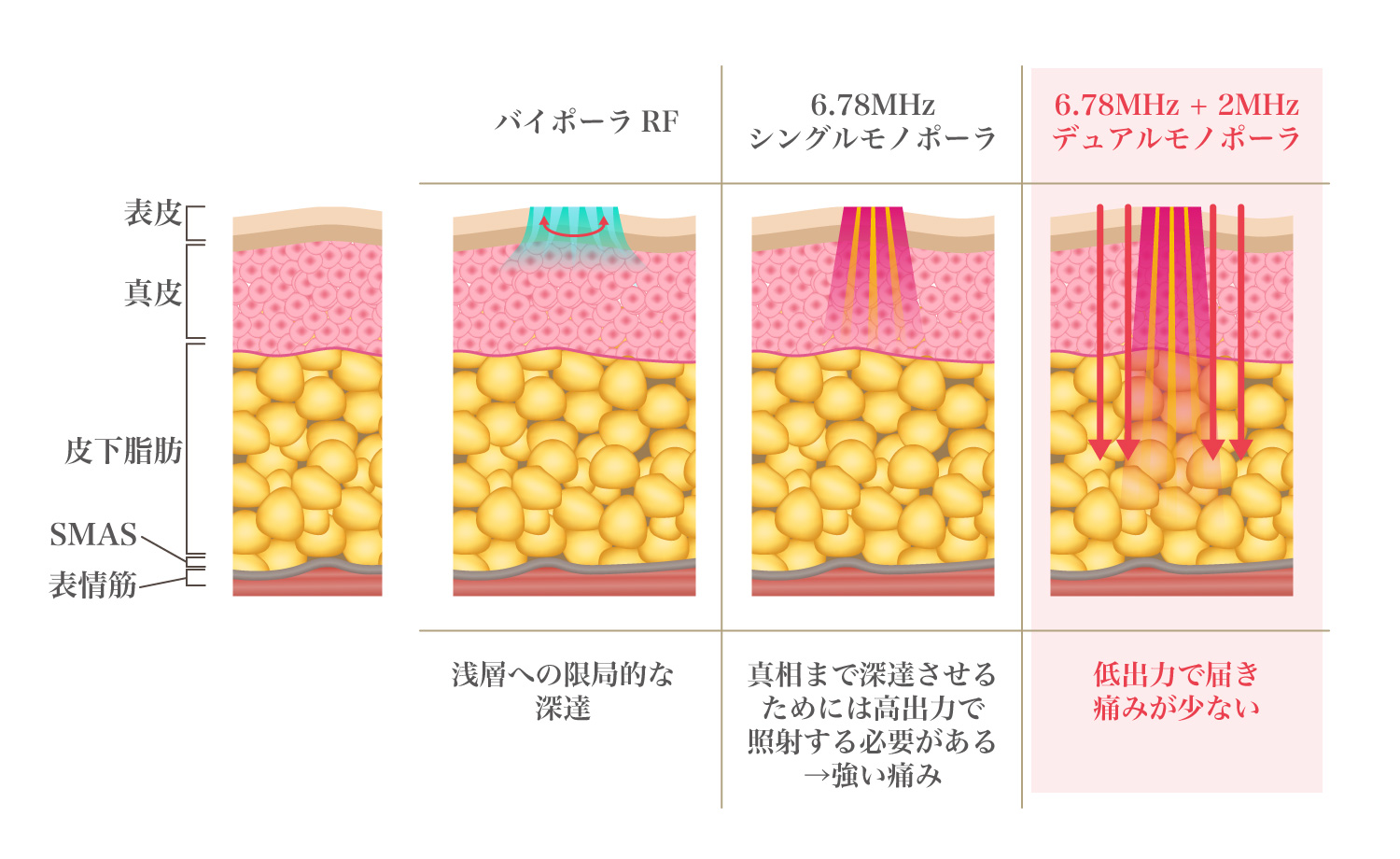 高周波の特徴として、2MHzは6.78MHzに比べてより深く浸透します。6.78MHzだけのモノポーラRFでも高出力で照射すれば、高周波を深く浸透することは可能ですが、引き換えに強い痛みを伴うことになります。