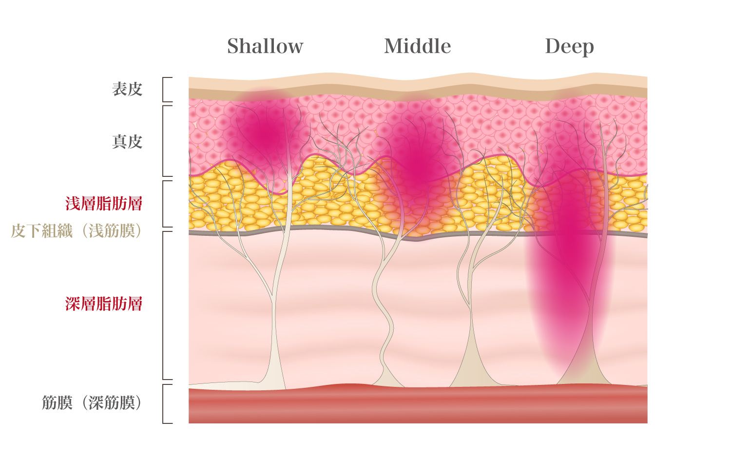 6.78MHzと2MHzの2種類の周波数の組み合わせにより、深い層にアプローチできるだけでなく、3段階の深さ「Shallow-Middle-Deep」を選択することが可能です。お顔のボリュームやたるみにより熱エネルギーの浸透を調整することにより、より効果的な施術を行うことが可能となります。